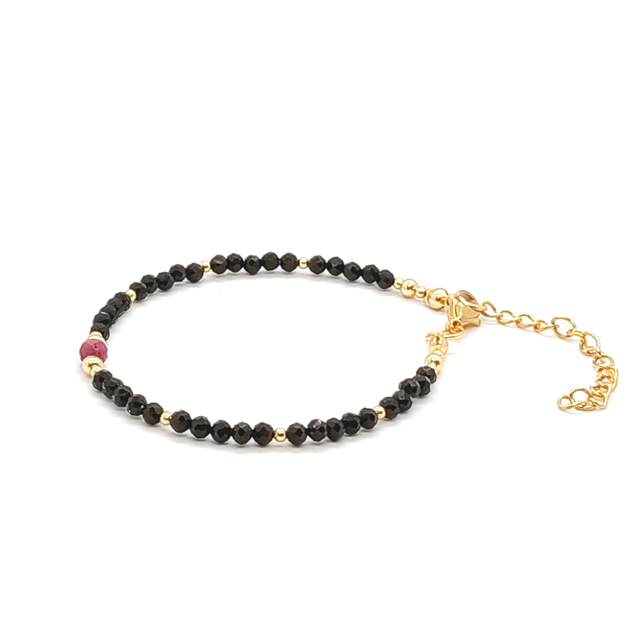 Bransoletka Rubin – kamienie szlachetne, Turmalin – kamienie naturalne półszlachetne. Minimalistyczna bransoletka wykonana ręcznie, na lince stalowej jubilerskiej. Obwód wewnętrzny: zgodnie z wybranym rozmiarem (+4cm łańcuszek regulacyjny). Bransoletka wyposażona w karabińczyk z pozłacanej stali chirurgicznej. Rubin o średnicy 4mm, Turmalin fasetowany o średnicy 3mm oraz kulki z pozłacanej stali chirurgicznej o średnicy 2 i 3mm. Elegancka bransoletka z kamieni naturalnych stanowi gustowną, oryginalna ozdobę nadgarstka. Bransoletka z kamieni naturalnych wykonana ręcznie w Polsce – Bransoletki Made in Poland.