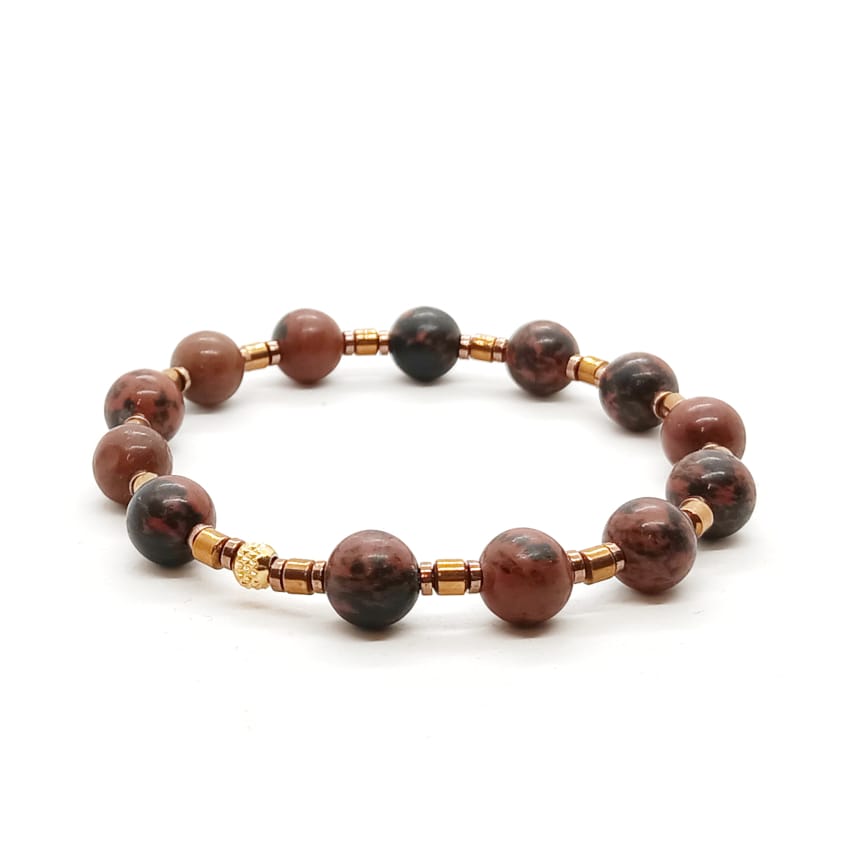 Bransoletka kamienie Agat brązowy i Hematyt miedziany – kamienie naturalne półszlachetne. Bransoletka z kamieni naturalnych wykonana ręcznie na elastycznej żyłce jubilerskiej – obwód wewnętrzny: 16,5cm. Kamienie Agat o średnicy 8mm, dodatki z hematytu w kolorze miedzianym oraz z pozłacanej stali chirurgicznej. Elegancka bransoletka z kamieni naturalnych stanowi gustowną i oryginalna ozdobę nadgarstka. Bransoletka wykonana ręcznie w Polsce – Bransoletki Made in Poland.