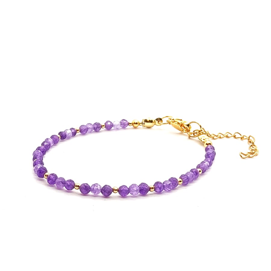Bransoletka Agat fioletowy – kamienie naturalne półszlachetne. Minimalistyczna bransoletka z kamieni naturalnych wykonana ręcznie na lince stalowej jubilerskiej z zapięciem typu karabińczyk, z dodatkową regulacją obwodu bransoletki (łańcuszek o długości 4cm). Minimalny obwód wewnętrzny bransoletki: 17cm. Kamienie Agat fioletowy fasetowany o średnicy 3mm. Dodatki ze stali chirurgicznej pozłacanej. Elegancka bransoletka z kamieni naturalnych stanowi gustowną i oryginalna ozdobę nadgarstka. Bransoletka wykonana ręcznie w Polsce – Bransoletki Made in Poland.
