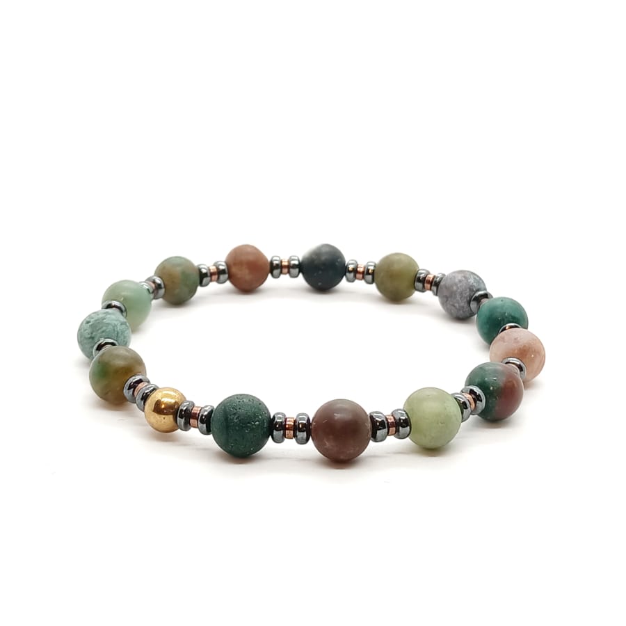 Bransoletka Agat indyjski – kamienie naturalne półszlachetne. Bransoletka z kamieni naturalnych wykonana ręcznie na elastycznej żyłce jubilerskiej – obwód wewnętrzny: 17,5cm. Kamienie Agat indyjski o średnicy 8mm, dodatki z hematytu w kolorze grafitowym, złotym miedzianym. Elegancka bransoletka z kamieni naturalnych stanowi gustowną i oryginalna ozdobę nadgarstka. Bransoletka wykonana ręcznie w Polsce – Bransoletki Made in Poland.