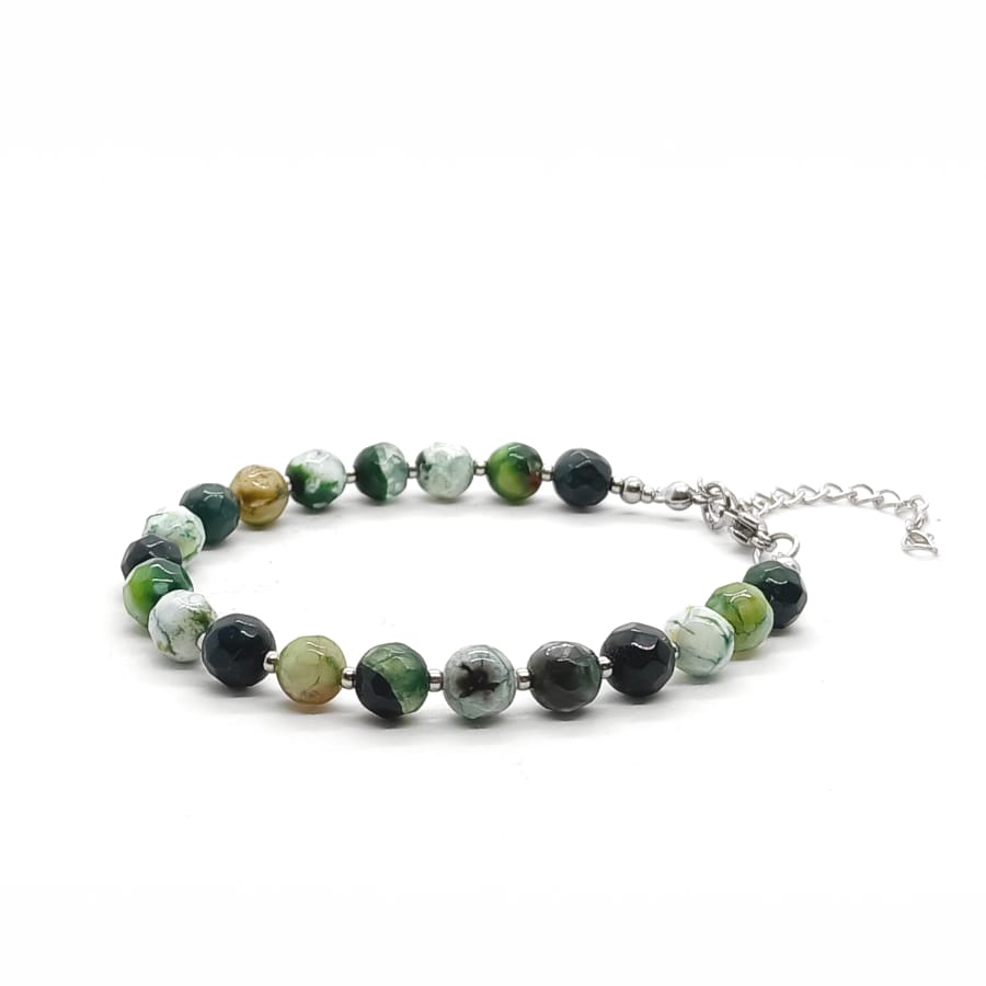 Bransoletka Agat ognisty zielony fasetowany – kamienie naturalne półszlachetne. Bransoletka z kamieni naturalnych wykonana ręcznie na lince stalowej jubilerskiej z zapięciem typu karabińczyk, z dodatkową regulacją obwodu bransoletki (łańcuszek o długości 4cm). Minimalny obwód wewnętrzny bransoletki: 16cm. Kamienie Agat ognisty zielony fasetowany o średnicy 6mm. Dodatki ze stali chirurgicznej. Elegancka bransoletka z kamieni naturalnych stanowi gustowną i oryginalna ozdobę nadgarstka. Bransoletka wykonana ręcznie w Polsce – Bransoletki Made in Poland.