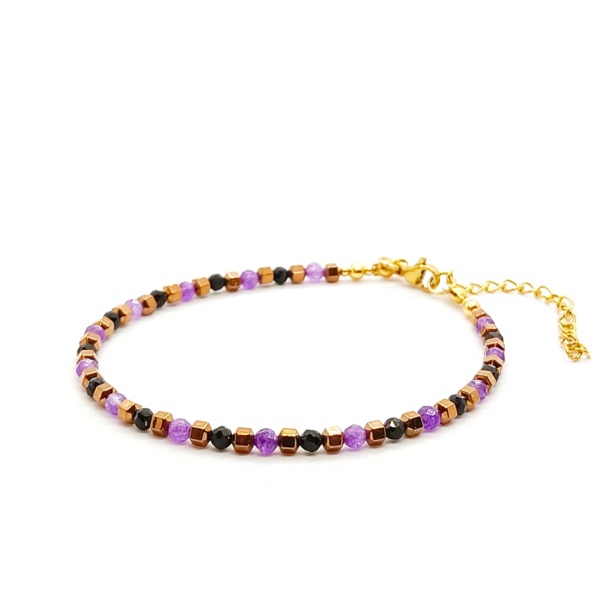 Bransoletka Agat, Turmalin, Hematyt – kamienie półszlachetne. Bransoletka wykonana ręcznie, na lince stalowej jubilerskiej – obwód wewnętrzny: 18cm (+4cm łańcuszek regulacyjny), wyposażona w karabińczyk z pozłacanej stali chirurgicznej. Kamień Agat fioletowy fasetowany i Turmalin czarny fasetowany o średnicy 3 mm, Hematyt w kolorze miedzianym o średnicy 3mm oraz stal chirurgiczna pozłacana o średnicy 2 i 3mm. Elegancka bransoletka z kamieni naturalnych stanowi gustowną, oryginalna ozdobę nadgarstka. Bransoletka z kamieni naturalnych wykonana ręcznie w Polsce – Bransoletki Made in Poland.