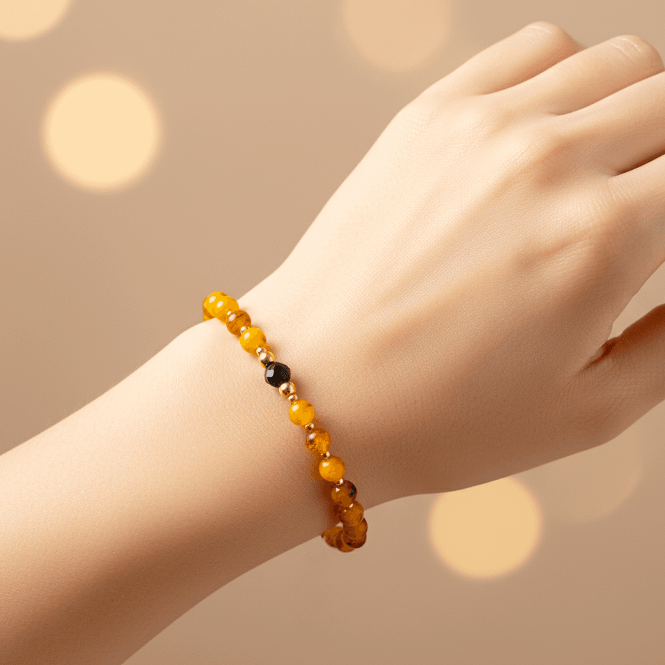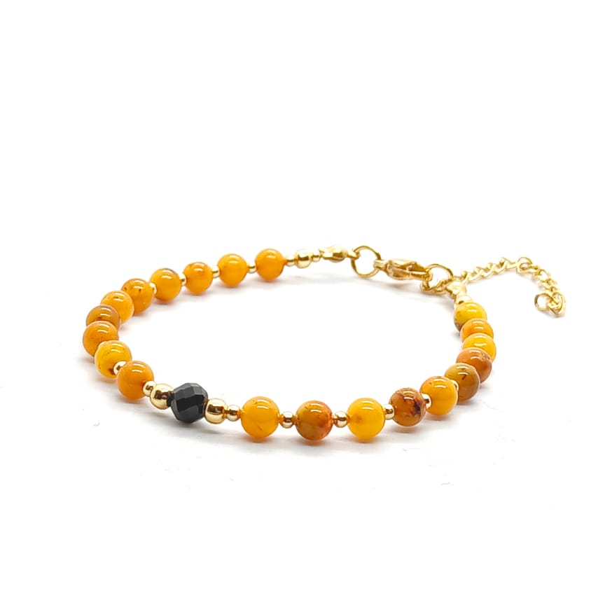 Bransoletka Bursztyn Bałtycki – minerał naturalny, żywica kopalna, Turmalin czarny – kamień naturalny. Bransoletka z minerałów naturalnych wykonana ręcznie na lince stalowej jubilerskiej z zapięciem typu karabińczyk, z dodatkową regulacją obwodu bransoletki (łańcuszek o długości 4cm). Minimalny obwód wewnętrzny bransoletki: 15,5cm. Bursztyn bałtycki o średnicy 5mm, Turmalin czarny fasetowany o średnicy 5mm. Dodatki ze stali chirurgicznej pozłacanej – kulki o średnicy 3mm i 2mm. Zapięcie i łańcuszek ze stali chirurgicznej pozłacanej. Elegancka bransoletka z kamieni naturalnych stanowi gustowną i oryginalna ozdobę nadgarstka. Bransoletka wykonana ręcznie w Polsce – Bransoletki Made in Poland.