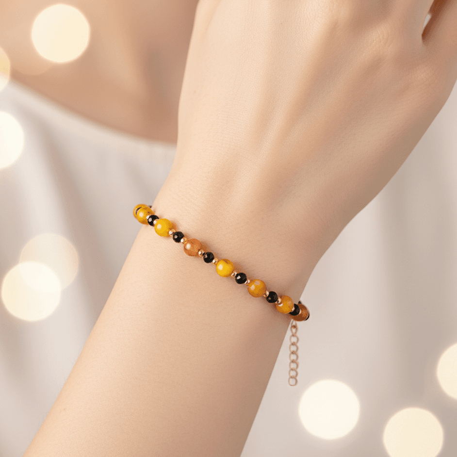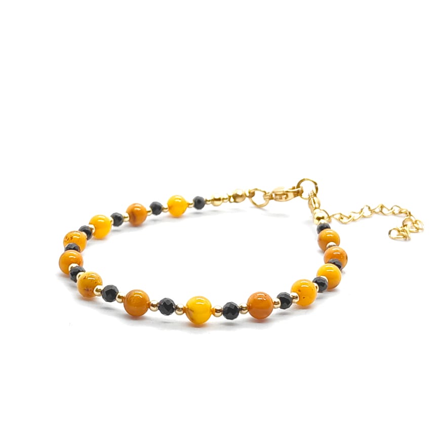 Bransoletka Bursztyn Bałtycki – minerał naturalny, żywica kopalna, Turmalin czarny – kamień naturalny. Bransoletka z minerałów naturalnych wykonana ręcznie na lince stalowej jubilerskiej z zapięciem typu karabińczyk, z dodatkową regulacją obwodu bransoletki (łańcuszek o długości 4cm). Minimalny obwód wewnętrzny bransoletki: 16,5cm. Bursztyn bałtycki o średnicy 5mm, Turmalin czarny fasetowany o średnicy 3mm. Dodatki ze stali chirurgicznej pozłacanej – kulki o średnicy 3mm i 2mm. Zapięcie i łańcuszek ze stali chirurgicznej pozłacanej. Elegancka bransoletka z kamieni naturalnych stanowi gustowną i oryginalna ozdobę nadgarstka. Bransoletka wykonana ręcznie w Polsce – Bransoletki Made in Poland.
