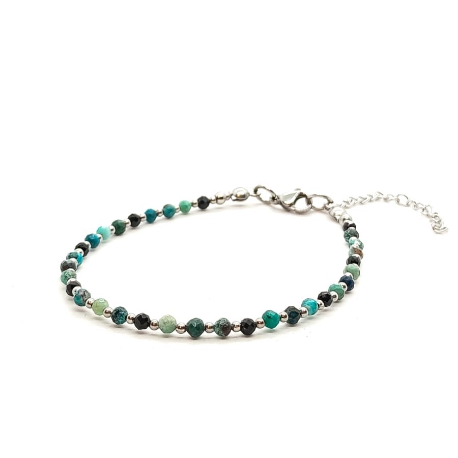 Bransoletka Chryzokola, Czarny Turmalin – kamienie naturalne półszlachetne. Bransoletka z kamieni naturalnych wykonana ręcznie na lince stalowej jubilerskiej z zapięciem typu karabińczyk, z dodatkową regulacją obwodu bransoletki (łańcuszek o długości 4cm). Minimalny obwód wewnętrzny bransoletki: 18cm. Kamienie Chryzokola o średnicy 3mm, Turmalin o średnicy 3mm. Dodatki ze stali chirurgicznej. Elegancka bransoletka z kamieni naturalnych stanowi gustowną i oryginalna ozdobę nadgarstka. Bransoletka wykonana ręcznie w Polsce – Bransoletki Made in Poland.
