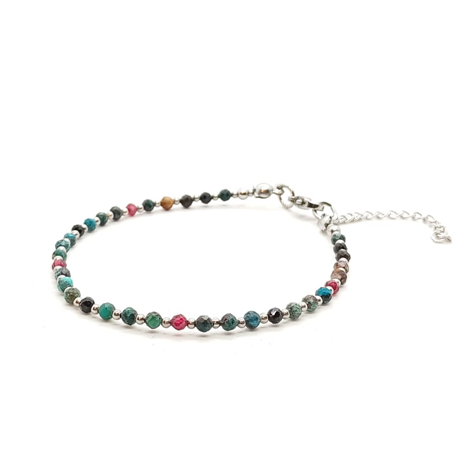 Bransoletka Chryzokola, Granat, Czarny Turmalin – kamienie naturalne półszlachetne. Bransoletka z kamieni naturalnych wykonana ręcznie na lince stalowej jubilerskiej z zapięciem typu karabińczyk, z dodatkową regulacją obwodu bransoletki (łańcuszek o długości 4cm). Minimalny obwód wewnętrzny bransoletki: 19cm. Kamienie Chryzokola o średnicy 3mm, Turmalin o średnicy 3mm, Granat o średnicy 3mm. Dodatki ze stali chirurgicznej. Elegancka bransoletka z kamieni naturalnych stanowi gustowną i oryginalna ozdobę nadgarstka. Bransoletka wykonana ręcznie w Polsce – Bransoletki Made in Poland.