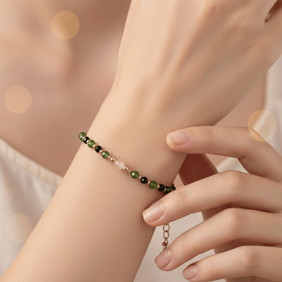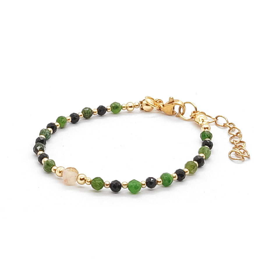 Bransoletka Czarny Turmalin, Diopsyt, Cytryn – kamienie naturalne półszlachetne. Bransoletka z kamieni naturalnych wykonana ręcznie na lince stalowej jubilerskiej z zapięciem typu karabińczyk, z dodatkową regulacją obwodu bransoletki (łańcuszek o długości 4cm). Minimalny obwód wewnętrzny bransoletki: 15cm. Kamienie Turmalin o średnicy 3mm, Diopsyt o średnicy 3,5mm, Cytryn o średnicy 4,5mm. Dodatki z pozłacanej stali chirurgicznej. Elegancka bransoletka z kamieni naturalnych stanowi gustowną i oryginalna ozdobę nadgarstka. Bransoletka wykonana ręcznie w Polsce – Bransoletki Made in Poland.