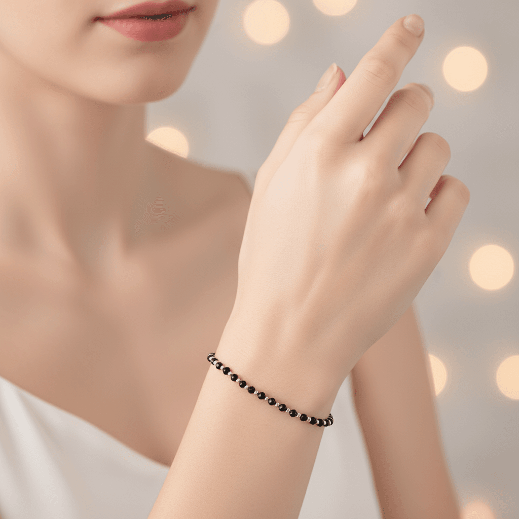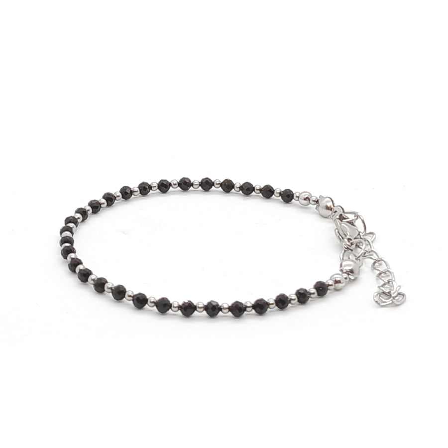 Bransoletka Czarny Turmalin – kamienie naturalne półszlachetne. Minimalistyczna bransoletka z kamieni naturalnych wykonana ręcznie na lince stalowej jubilerskiej z zapięciem typu karabińczyk. Rozmiar: obwód wewnętrzny wg wybranego rozmiaru + dodatkowo łańcuszek regulacyjny o długości 4cm. Kamienie Turmalin o średnicy 3mm. Dodatki metalowe ze stali chirurgicznej o średnicy 3mm i 2mm. Elegancka bransoletka z kamieni naturalnych stanowi gustowną i oryginalna ozdobę nadgarstka. Bransoletka wykonana ręcznie w Polsce – Bransoletki Made in Poland.
