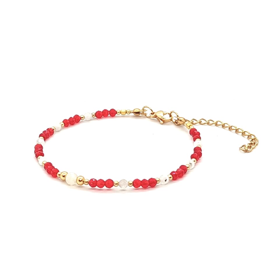 Bransoletka Czerwony Spinel, Kamień księżycowy – kamienie naturalne półszlachetne. Minimalistyczna bransoletka z kamieni naturalnych wykonana ręcznie na lince stalowej jubilerskiej z zapięciem typu karabińczyk, z dodatkową regulacją obwodu bransoletki (łańcuszek o długości 4cm). Minimalny obwód wewnętrzny bransoletki: 16,5cm. Kamienie Cytryn fasetowany o średnicy 4mm, Spinel czerwony fasetowany o średnicy 3mm, Kamień księżycowy fasetowany o średnicy 3mm, hematyt heksagonalny w kolorze złota oraz kulki ze stali chirurgicznej pozłacanej o średnicy 2mm. Elegancka bransoletka z kamieni naturalnych stanowi gustowną i oryginalna ozdobę nadgarstka. Bransoletka wykonana ręcznie w Polsce – Bransoletki Made in Poland.