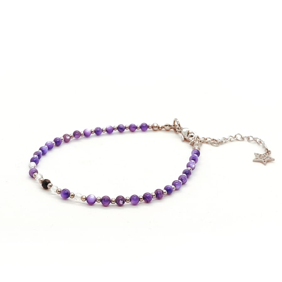 Bransoletka Kryształ górski, Turmalin, Masa perłowa – kamienie naturalne półszlachetne. Delikatna minimalistyczna bransoletka wykonana ręcznie, na lince stalowej jubilerskiej – obwód wewnętrzny: 18cm (+4cm łańcuszek regulacyjny z zawieszką w kształcie gwiazdki), wyposażona w karabińczyk ze stali chirurgicznej. Turmalin fasetowany o średnicy 3mm, Kryształ górski fasetowany o średnicy 3mm, Masa perłowa w kolorze fioletowym o średnicy 3mm oraz kulki ze stali chirurgicznej o średnicy 2mm. Elegancka bransoletka z kamieni naturalnych stanowi gustowną, oryginalna ozdobę nadgarstka. Bransoletka z kamieni naturalnych wykonana ręcznie w Polsce – Bransoletki Made in Poland.