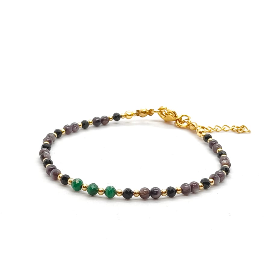 Bransoletka Malachit, Turmalin czarny, Masa perłowa – kamienie naturalne półszlachetne. Delikatna bransoletka wykonana ręcznie, na lince stalowej jubilerskiej – obwód wewnętrzny: 17cm (+4cm łańcuszek regulacyjny), wyposażona w karabińczyk z pozłacanej stali chirurgicznej. Malachit fasetowany o średnicy 3mm, Turmalin czarny fasetowany o średnicy 3mm, Masa perłowa o średnicy 3mm oraz kulki z pozłacanej stali chirurgicznej o średnicy 2 i 3mm. Elegancka bransoletka z kamieni naturalnych stanowi gustowną, oryginalna ozdobę nadgarstka. Bransoletka z kamieni naturalnych wykonana ręcznie w Polsce – Bransoletki Made in Poland.
