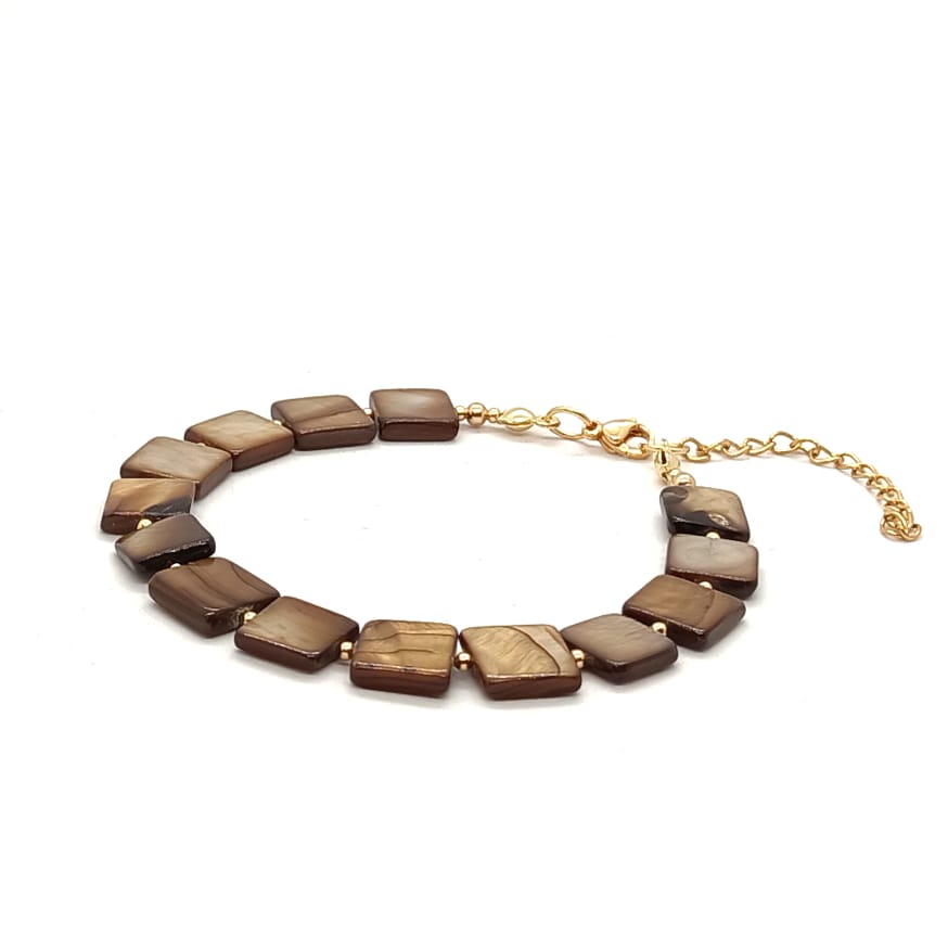 Bransoletka Masa perłowa – kamienie naturalne. Bransoletka z kamieni naturalnych wykonana ręcznie na lince stalowej jubilerskiej. Minimalny obwód wewnętrzny: 19cm (+4cm łańcuszek regulacyjny pozwalający na indywidualne dopasowanie do obwodu). Bransoletka wyposażona w zapięcie typu karabińczyk z pozłacanej stali chirurgicznej. Masa perłowa kwadraty w rozmiarze 10x10mm. Elementy dodatkowe z pozłacanej stali chirurgicznej – kulki o średnicy 2 i 3mm. Elegancka bransoletka z kamieni naturalnych stanowi gustowną, oryginalna ozdobę nadgarstka. Bransoletka z kamieni naturalnych wykonana ręcznie w Polsce – Bransoletki Made in Poland.