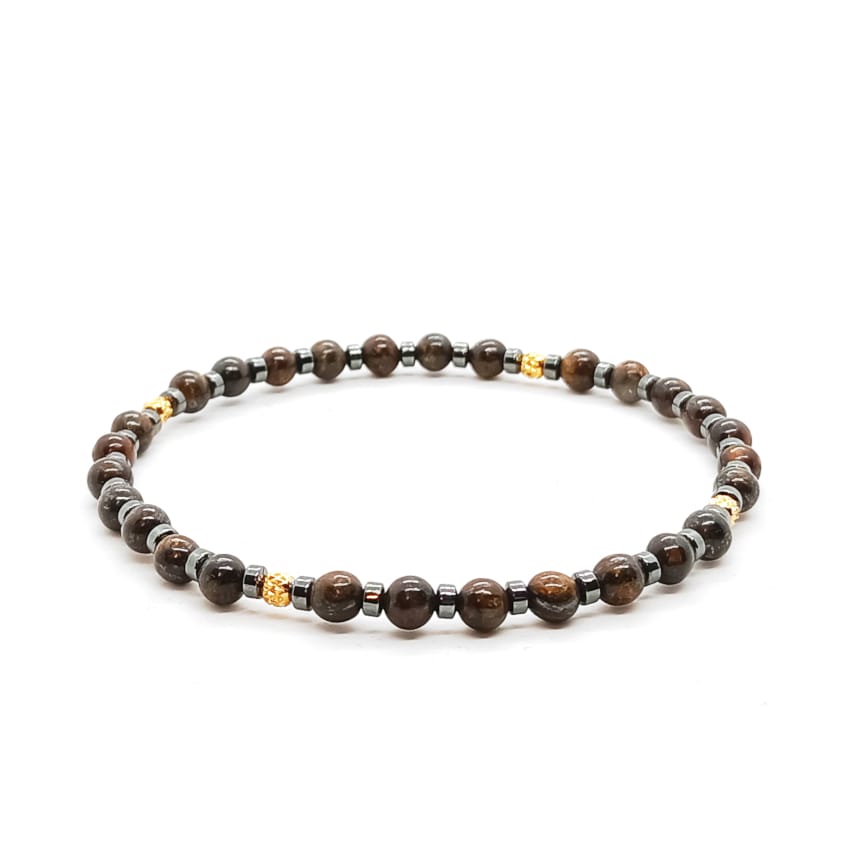 Bransoletka męska, kamienie Bronzyt – kamienie naturalne półszlachetne. Bransoletka z kamieni naturalnych wykonana ręcznie na elastycznej żyłce jubilerskiej – obwód wewnętrzny: 19cm. Kamienie Bronzyt o średnicy 5mm, dodatki z hematytu w kolorze grafitowym oraz ze stali chirurgicznej pozłacanej. Elegancka bransoletka z kamieni naturalnych stanowi gustowną i oryginalna ozdobę nadgarstka. Bransoletka wykonana ręcznie w Polsce – Bransoletki Made in Poland.