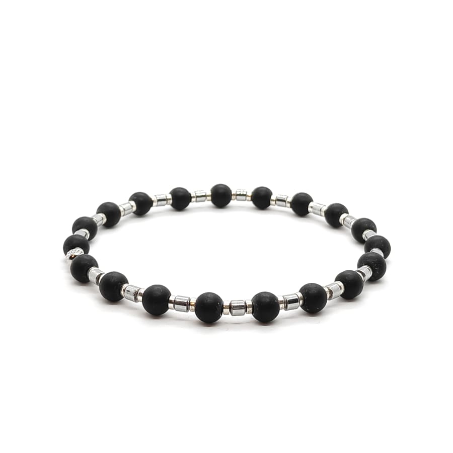 Bransoletka męska Onyks – kamienie naturalne półszlachetne. Bransoletka z kamieni naturalnych wykonana ręcznie na elastycznej żyłce jubilerskiej – obwód wewnętrzny: 20cm. Onyks kulki gładkie matowe o średnicy 6mm, oraz dodatki z hematytu w kolorze srebra oraz stali chirurgicznej w kolorze srebra. Elegancka bransoletka z kamieni naturalnych stanowi gustowną i oryginalna ozdobę nadgarstka. Bransoletka wykonana ręcznie w Polsce – Bransoletki Made in Poland.