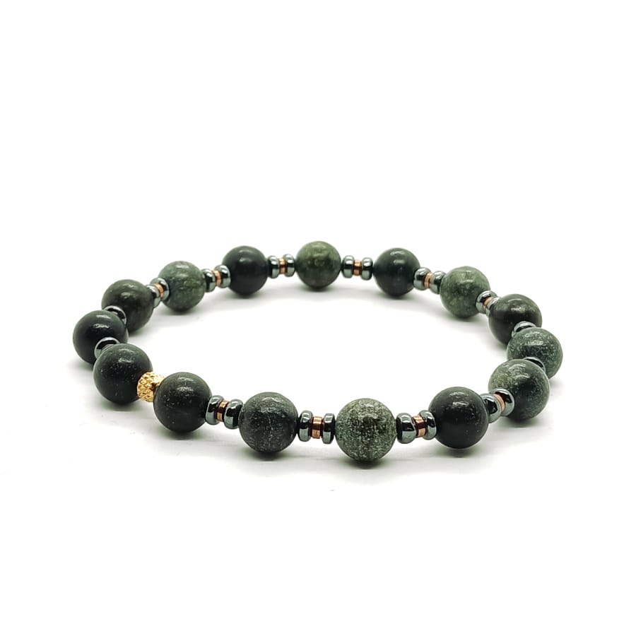Bransoletka męska, kamienie Serpentynit – kamienie naturalne półszlachetne. Bransoletka z kamieni naturalnych wykonana ręcznie na elastycznej żyłce jubilerskiej – obwód wewnętrzny: 18cm. Kamienie Serpentynit o średnicy 8mm, dodatki z hematytu w kolorze grafitowym oraz ze stali chirurgicznej pozłacanej. Elegancka bransoletka z kamieni naturalnych stanowi gustowną i oryginalna ozdobę nadgarstka. Bransoletka wykonana ręcznie w Polsce – Bransoletki Made in Poland.