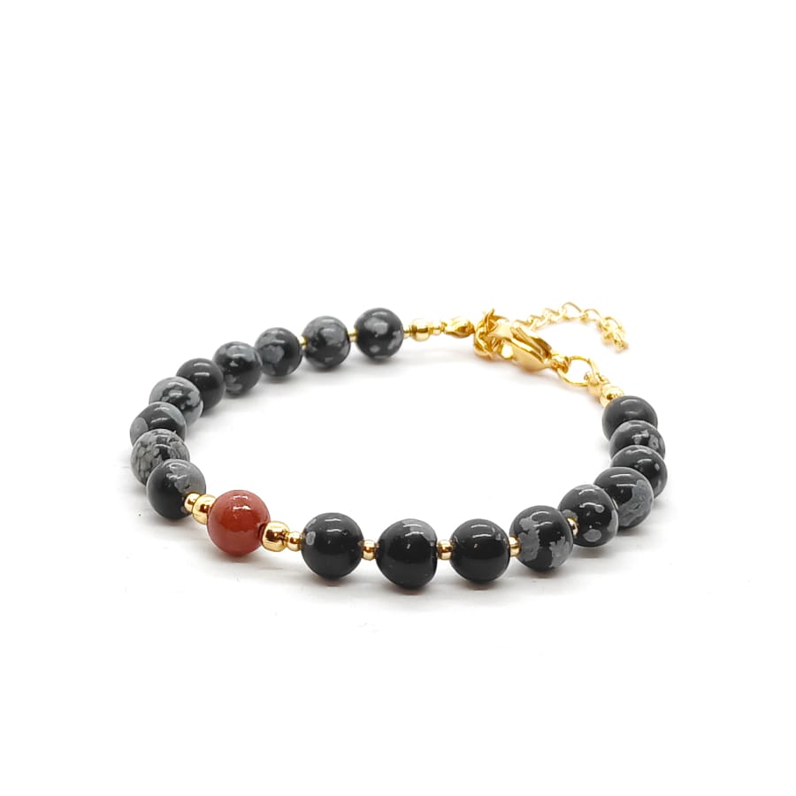Bransoletka Obsydian śnieżny i Jaspis czerwony – kamienie naturalne półszlachetne. Bransoletka z kamieni naturalnych wykonana ręcznie na lince stalowej jubilerskiej z zapięciem typu karabińczyk, z dodatkową regulacją obwodu bransoletki (łańcuszek o długości 4cm). Minimalny obwód wewnętrzny bransoletki: 16cm. Kamienie Obsydian śnieżny i Jaspis czerwony o średnicy 6mm. Dodatki ze stali chirurgicznej pozłacanej. Elegancka bransoletka z kamieni naturalnych stanowi gustowną i oryginalna ozdobę nadgarstka. Bransoletka wykonana ręcznie w Polsce – Bransoletki Made in Poland.