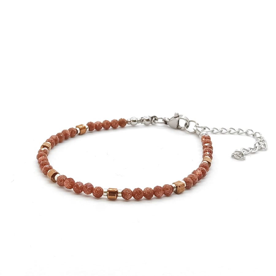 Bransoletka Piasek Pustyni i Hematyt – bransoletka z piasku pustyni (kamieni o charakterystycznie mieniącej się brązowej barwie). Bransoletka wykonana ręcznie na lince stalowej jubilerskiej z zapięciem typu karabińczyk, z dodatkową regulacją obwodu bransoletki (łańcuszek o długości 4cm). Minimalny obwód wewnętrzny bransoletki: 15,5cm. Kamienie Piasek Pustyni o średnicy 3mm, Hematyt w kolorze miedzianym o średnicy 3mm. Dodatki ze stali chirurgicznej. Elegancka bransoletka z kamieni naturalnych stanowi gustowną i oryginalna ozdobę nadgarstka. Bransoletka wykonana ręcznie w Polsce – Bransoletki Made in Poland.