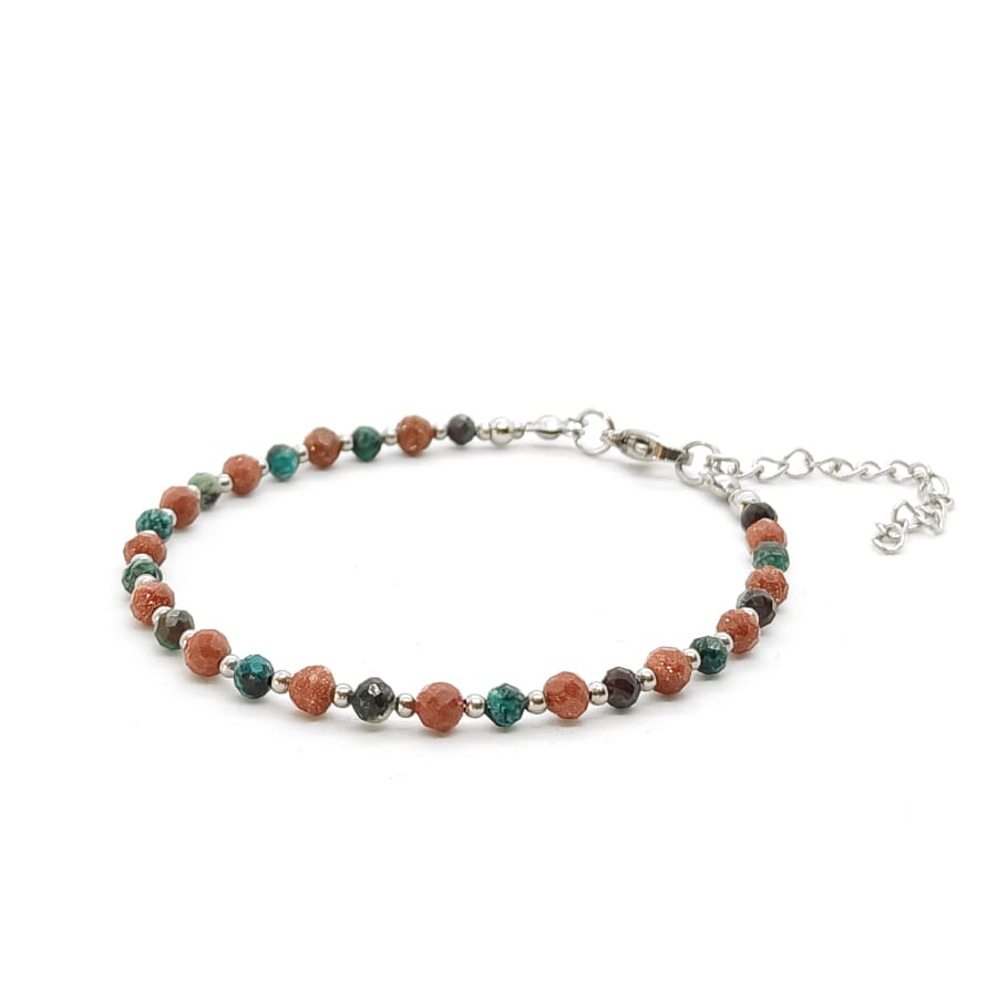 Bransoletka Piasek Pustyni i Chryzokola – bransoletka z piasku pustyni (kamieni o charakterystycznie mieniącej się brązowej barwie). Bransoletka wykonana ręcznie na lince stalowej jubilerskiej z zapięciem typu karabińczyk, z dodatkową regulacją obwodu bransoletki (łańcuszek o długości 4cm). Minimalny obwód wewnętrzny bransoletki: 17cm. Kamienie Piasek Pustyni o średnicy 4mm i Chryzokola o średnicy 3mm. Dodatki ze stali chirurgicznej. Elegancka bransoletka z kamieni naturalnych stanowi gustowną i oryginalna ozdobę nadgarstka. Bransoletka wykonana ręcznie w Polsce – Bransoletki Made in Poland.
