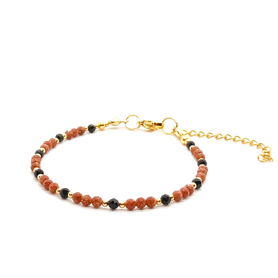 Bransoletka Piasek Pustyni i Turmalin czarny – bransoletka z turmalinu czarnego oraz kamieni piasek pustyni o charakterystycznie mieniącej się brązowej barwie. Bransoletka wykonana ręcznie na lince stalowej jubilerskiej z zapięciem typu karabińczyk, z dodatkową regulacją obwodu bransoletki (łańcuszek o długości 4cm). Minimalny obwód wewnętrzny bransoletki: 17cm. Kamienie Turmalin czarny oraz Piasek Pustyni o średnicy 3mm. Dodatki z pozłacanej stali chirurgicznej. Elegancka bransoletka z kamieni naturalnych stanowi gustowną i oryginalna ozdobę nadgarstka. Bransoletka wykonana ręcznie w Polsce – Bransoletki Made in Poland.