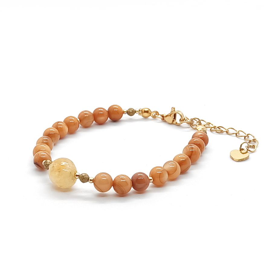 Bransoletka pozłacana Cytryn, Masa perłowa, Hematyt – kamienie naturalne. Bransoletka z kamieni naturalnych wykonana ręcznie na lince stalowej jubilerskiej. Minimalny obwód wewnętrzny: 16cm. Bransoletka wyposażona w karabińczyk oraz łańcuszek regulacyjny o długości 4cm zakończony zawieszką w kształcie serduszka o wymiarach 5x6mm. Cytryn o średnicy 9mm, masa perłowa o średnicy 6mm, hematyt o średnicy 3mm. Elementy metalowe ze stali chirurgicznej pozłacanej o średnicy 2mm. Elegancka bransoletka z kamieni naturalnych stanowi gustowną, oryginalna ozdobę nadgarstka. Bransoletka z kamieni naturalnych wykonana ręcznie w Polsce – Bransoletki Made in Poland.