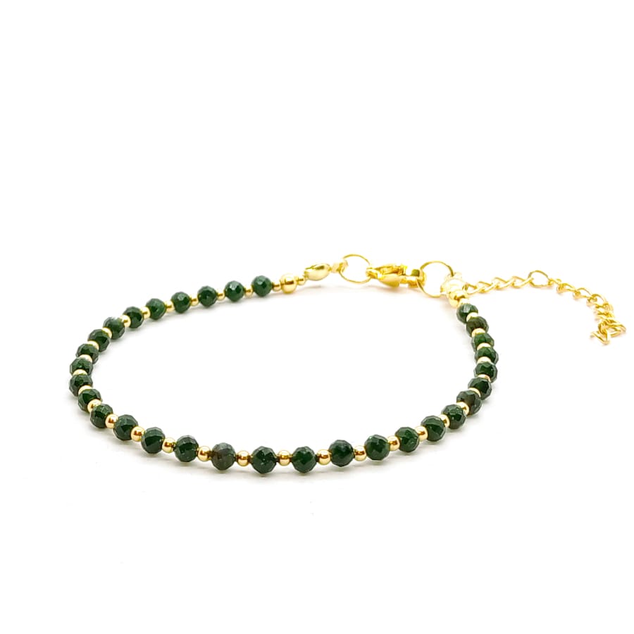 Bransoletka Szmaragd Nilu (Zielony Piasek Pustyni) – bransoletka z kamieni o charakterystycznie mieniącej się barwie ciemno zielonej. Bransoletka wykonana ręcznie na lince stalowej jubilerskiej z zapięciem typu karabińczyk, z dodatkową regulacją obwodu bransoletki (łańcuszek o długości 4cm). Minimalny obwód wewnętrzny bransoletki: 18cm. Kamienie Szmaragd Nilu o średnicy 3mm. Dodatki z pozłacanej stali chirurgicznej. Elegancka bransoletka z kamieni naturalnych stanowi gustowną i oryginalna ozdobę nadgarstka. Bransoletka wykonana ręcznie w Polsce – Bransoletki Made in Poland.