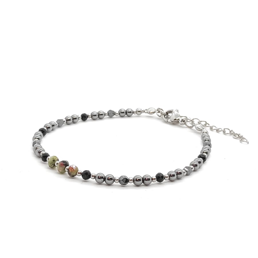 Bransoletka kamienie Terahertz, Turmalin, Jadeit i Hematyt. Bransoletka wykonana ręcznie, na jubilerskiej lince stalowej – obwód wewnętrzny: 19cm (+4cm łańcuszek regulacyjny), zapięcie typu karabińczyk ze stali chirurgicznej. Terahertz o średnicy 3mm, czarny turmalin fasetowany o średnicy 3, jadeit fasetowany o średnicy 4mm oraz hematyt fasetowany o średnicy 3. Dodatki ze stali chirurgicznej. Elegancka bransoletka z kamieni naturalnych stanowi gustowną, oryginalna ozdobę nadgarstka. Bransoletka z kamieni naturalnych wykonana ręcznie w Polsce – Bransoletki Made in Poland.