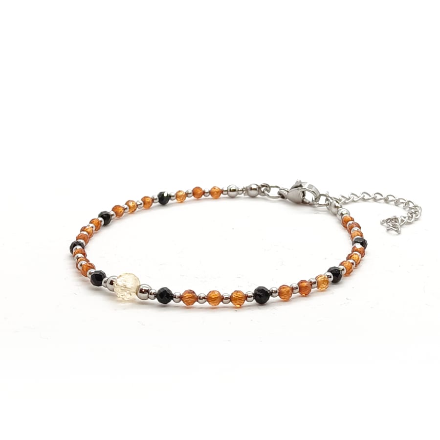 Bransoletka Turmalin czarny, Cytryn, Granat brązowy – kamienie naturalne półszlachetne. Minimalistyczna bransoletka z kamieni naturalnych wykonana ręcznie, na lince stalowej jubilerskiej – obwód wewnętrzny: 17,5cm (+4cm łańcuszek regulacyjny), wyposażona w karabińczyk ze stali chirurgicznej. Kamienie Cytryn o średnicy 5mm, Turmalin czarny o średnicy 3mm, Granat brązowy o średnicy 3mm. Dodatki ze stali chirurgicznej. Elegancka bransoletka z kamieni naturalnych stanowi gustowną i oryginalna ozdobę nadgarstka. Bransoletka wykonana ręcznie w Polsce – Bransoletki Made in Poland.