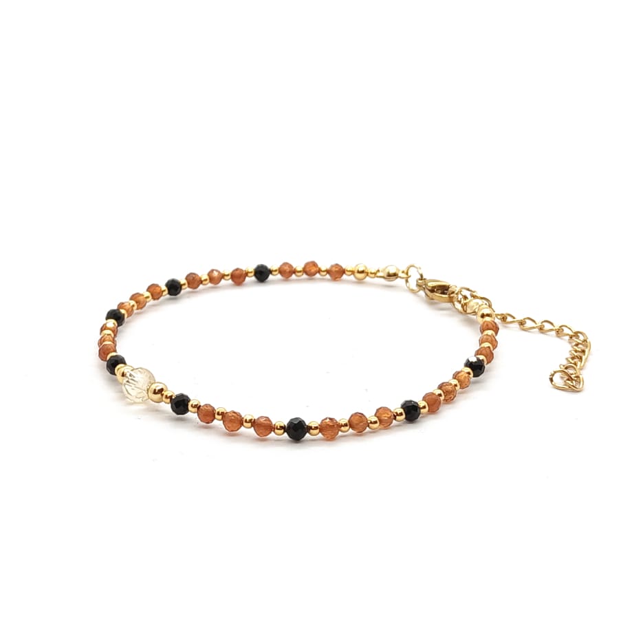 Bransoletka Turmalin czarny, Cytryn, Granat brązowy – kamienie naturalne półszlachetne. Minimalistyczna bransoletka z kamieni naturalnych wykonana ręcznie, na lince stalowej jubilerskiej – obwód wewnętrzny: 17,5cm (+4cm łańcuszek regulacyjny), wyposażona w karabińczyk ze stali chirurgicznej pozłacanej. Kamienie Cytryn o średnicy 5mm, Turmalin czarny o średnicy 3mm, Granat brązowy o średnicy 3mm. Dodatki ze stali chirurgicznej pozłacanej. Elegancka bransoletka z kamieni naturalnych stanowi gustowną i oryginalna ozdobę nadgarstka. Bransoletka wykonana ręcznie w Polsce – Bransoletki Made in Poland.