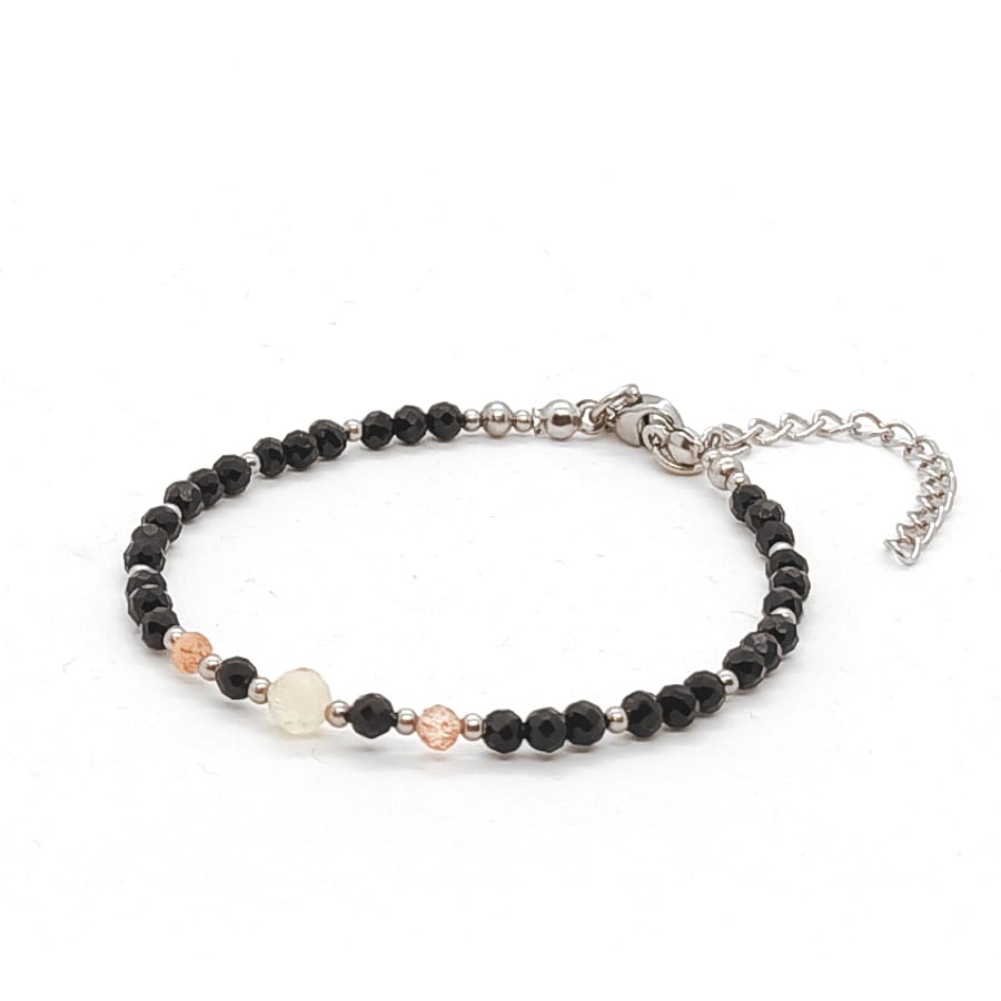 Bransoletka Turmalin czarny, Cytryn, Kamień słoneczny – kamienie naturalne półszlachetne. Minimalistyczna bransoletka wykonana ręcznie, na lince stalowej jubilerskiej – obwód wewnętrzny: 15,5cm (+4cm łańcuszek regulacyjny), wyposażona w karabińczyk ze stali chirurgicznej. Turmalin czarny fasetowany o średnicy 3mm, Kamień słoneczny fasetowany o średnicy 3mm, Cytryn fasetowany o średnicy 4mm oraz kulki ze stali chirurgicznej o średnicy 2 i 3mm. Elegancka bransoletka z kamieni naturalnych stanowi gustowną, oryginalna ozdobę nadgarstka. Bransoletka z kamieni naturalnych wykonana ręcznie w Polsce – Bransoletki Made in Poland.