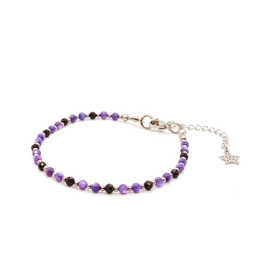Bransoletka Turmalin, Masa perłowa – kamienie naturalne półszlachetne. Delikatna minimalistyczna bransoletka wykonana ręcznie, na lince stalowej jubilerskiej – obwód wewnętrzny: 17,5cm (+4cm łańcuszek regulacyjny z zawieszką w kształcie gwiazdki), wyposażona w karabińczyk ze stali chirurgicznej. Turmalin fasetowany o średnicy 3mm, Masa perłowa w kolorze fioletowym o średnicy 3mm oraz kulki ze stali chirurgicznej o średnicy 2mm. Elegancka bransoletka z kamieni naturalnych stanowi gustowną, oryginalna ozdobę nadgarstka. Bransoletka z kamieni naturalnych wykonana ręcznie w Polsce – Bransoletki Made in Poland.
