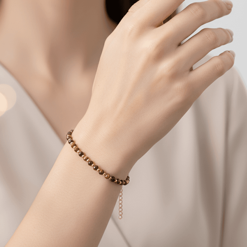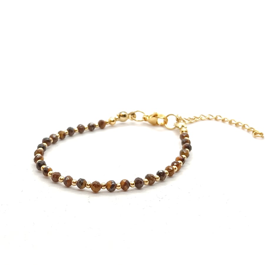 Bransoletka Tygrysie oko – kamienie naturalne półszlachetne. Minimalistyczna bransoletka z kamieni naturalnych wykonana ręcznie na lince stalowej jubilerskiej z zapięciem typu karabińczyk, z dodatkową regulacją obwodu bransoletki (łańcuszek o długości 4cm). Minimalny obwód wewnętrzny bransoletki: 15,5cm. Kamienie Tygrysie oko fasetowane o średnicy 3mm. Dodatki ze stali chirurgicznej pozłacanej. Elegancka bransoletka z kamieni naturalnych stanowi gustowną i oryginalna ozdobę nadgarstka. Bransoletka wykonana ręcznie w Polsce – Bransoletki Made in Poland.