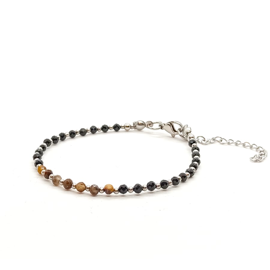 Bransoletka Tygrysie oko, Turmalin czarny – kamienie naturalne półszlachetne. Minimalistyczna bransoletka z kamieni naturalnych wykonana ręcznie na lince stalowej jubilerskiej z zapięciem typu karabińczyk, z dodatkową regulacją obwodu bransoletki (łańcuszek o długości 4cm). Minimalny obwód wewnętrzny bransoletki: 17cm. Kamienie Tygrysie oko fasetowane o średnicy 3mm, Turmalin czarny fasetowany o średnicy 3mm. Dodatki ze stali chirurgicznej. Elegancka bransoletka z kamieni naturalnych stanowi gustowną i oryginalna ozdobę nadgarstka. Bransoletka wykonana ręcznie w Polsce – Bransoletki Made in Poland. Zobacz też inne dostępne rozmiary.
