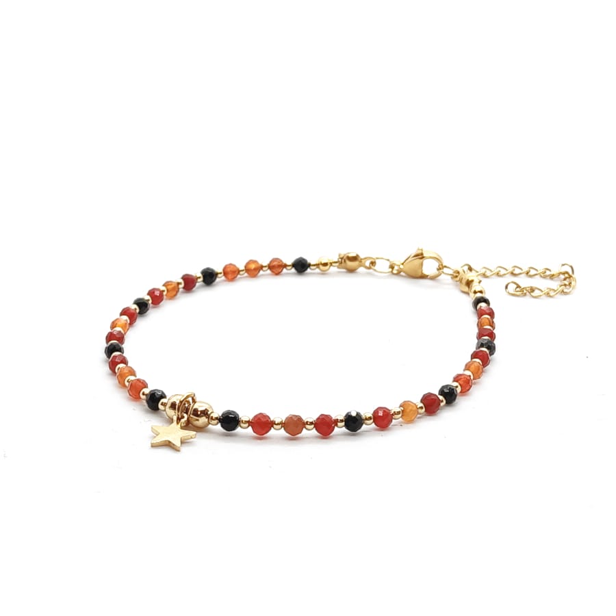 Bransoletka z gwiazdką Onyks czerwony i Onyks czarny – kamienie naturalne półszlachetne. Minimalistyczna bransoletka z kamieni naturalnych wykonana ręcznie na lince stalowej jubilerskiej z zapięciem typu karabińczyk, z dodatkową regulacją obwodu bransoletki (łańcuszek o długości 4cm). Minimalny obwód wewnętrzny bransoletki: 20cm. Kamienie Onyks czerwony fasetowany o średnicy 3mm, Onyks czarny fasetowany o średnicy 3mm. Dodatki ze stali chirurgicznej pozłacanej. Elegancka bransoletka z kamieni naturalnych stanowi gustowną i oryginalna ozdobę nadgarstka. Bransoletka wykonana ręcznie w Polsce – Bransoletki Made in Poland.