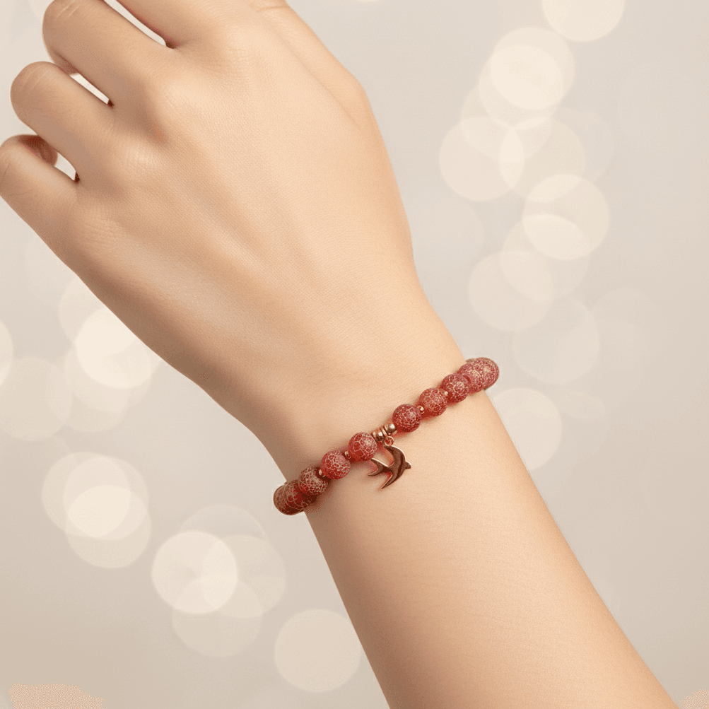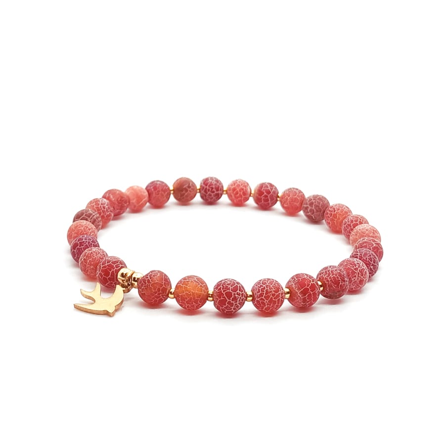 Bransoletka damska z czerwonych Agatów kwasowanych – kamienie naturalne półszlachetne. Bransoletka z zawieszką jaskółka z pozłacanej stali chirurgicznej. Bransoletka z kamieni naturalnych wykonana ręcznie na elastycznej żyłce jubilerskiej – obwód wewnętrzny: 16,5cm. Agat czerwony o średnicy 6mm. Wszystkie elementy dodatkowe z pozłacanej stali chirurgicznej. Elegancka bransoletka z kamieni naturalnych i pozłacanej stali chirurgicznej stanowi gustowną, oryginalna ozdobę nadgarstka. Bransoletka z kamieni naturalnych wykonana ręcznie w Polsce – Bransoletki Made in Poland.