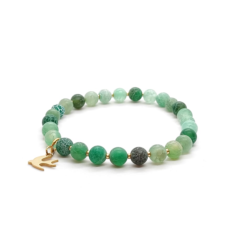 Bransoletka damska z zielonych Agatów kwasowanych – kamienie naturalne półszlachetne. Bransoletka z zawieszką jaskółka z pozłacanej stali chirurgicznej. Bransoletka z kamieni naturalnych wykonana ręcznie na elastycznej żyłce jubilerskiej – obwód wewnętrzny: 16,5cm. Agat zielony o średnicy 6mm. Wszystkie elementy dodatkowe z pozłacanej stali chirurgicznej. Elegancka bransoletka z kamieni naturalnych i pozłacanej stali chirurgicznej stanowi gustowną, oryginalna ozdobę nadgarstka. Bransoletka z kamieni naturalnych wykonana ręcznie w Polsce – Bransoletki Made in Poland.
