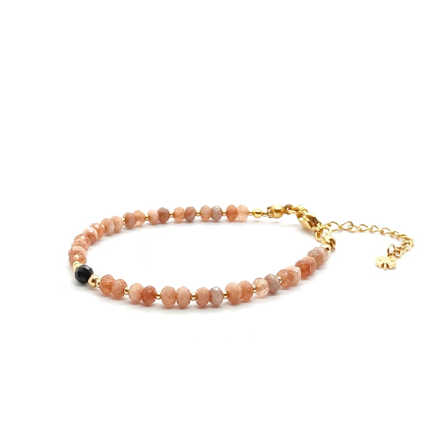 Bransoletka z koniczynką – kamienie Turmalin, Jadeit. Bransoletka wykonana ręcznie, na jubilerskiej lince stalowej – obwód wewnętrzny: 17cm (+4cm łańcuszek regulacyjny z zawieszką w kształcie czterolistnej koniczynki), zapięcie typu karabińczyk ze stali chirurgicznej. Czarny turmalin fasetowany o średnicy 5mm, jadeit fasetowany oponka o średnicy 3mm. Dodatki ze stali chirurgicznej. Elegancka bransoletka z kamieni naturalnych stanowi gustowną, oryginalna ozdobę nadgarstka. Bransoletka z kamieni naturalnych wykonana ręcznie w Polsce – Bransoletki Made in Poland.