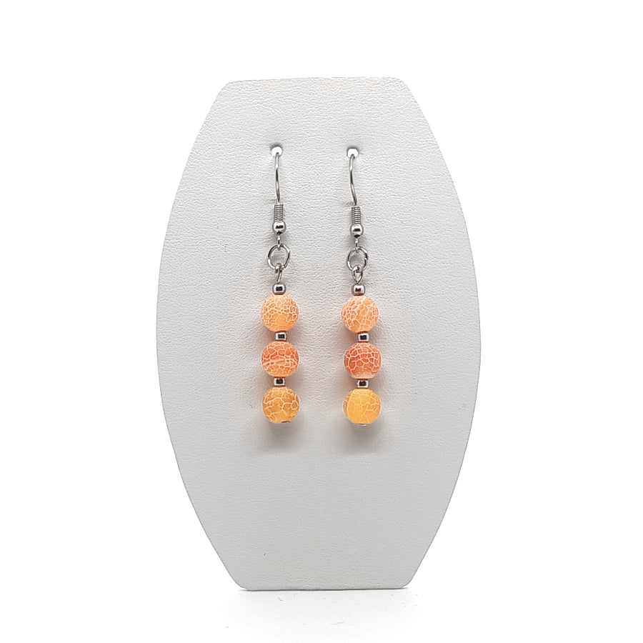Kolczyki Agat kwasowany – kamienie naturalne. Kolczyki z kamieni naturalnych wykonane ręcznie. Długość kolczyka wynosi 57mm. Kolczyki wyposażone są w zapięcie typu bigle otwarte ze stali chirurgicznej. Agat kwasowany o średnicy 8mm. Elementy dodatkowe ze stali chirurgicznej – kulki o średnicy 3mm. Kolczyki z kamieni naturalnych wykonane ręcznie w Polsce – Kolczyki Made in Poland.