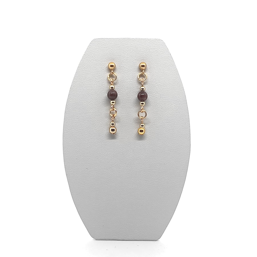 Kolczyki pozłacane Granat – kamienie naturalne. Kolczyki z kamieni naturalnych wykonane ręcznie. Długość kolczyka wynosi 38mm. Kolczyki wyposażone są w zapięcie typu sztyft ze stali chirurgicznej pozłacanej. Granat o średnicy 5mm. Elementy dodatkowe ze stali chirurgicznej pozłacanej – kulki o średnicy 4 i 3mm. Kolczyki z kamieni naturalnych wykonane ręcznie w Polsce – Kolczyki Made in Poland.