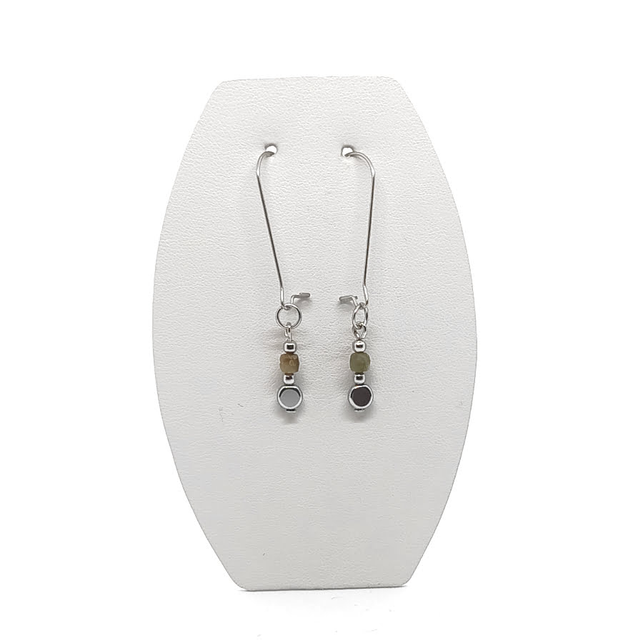 Kolczyki Turmalin, Hematyt – kamienie naturalne. Kolczyki z kamieni naturalnych wykonane ręcznie. Długość kolczyka wynosi 54mm. Kolczyki wyposażone są w zapięcie typu bigle zamknięte ze stali chirurgicznej. Turmalin kostka o wymiarach 4mm. Hematyt pastylki srebrne o średnicy 5mm. Elementy dodatkowe ze stali chirurgicznej – kulki o średnicy 3mm. Kolczyki z kamieni naturalnych wykonane ręcznie w Polsce – Kolczyki Made in Poland.