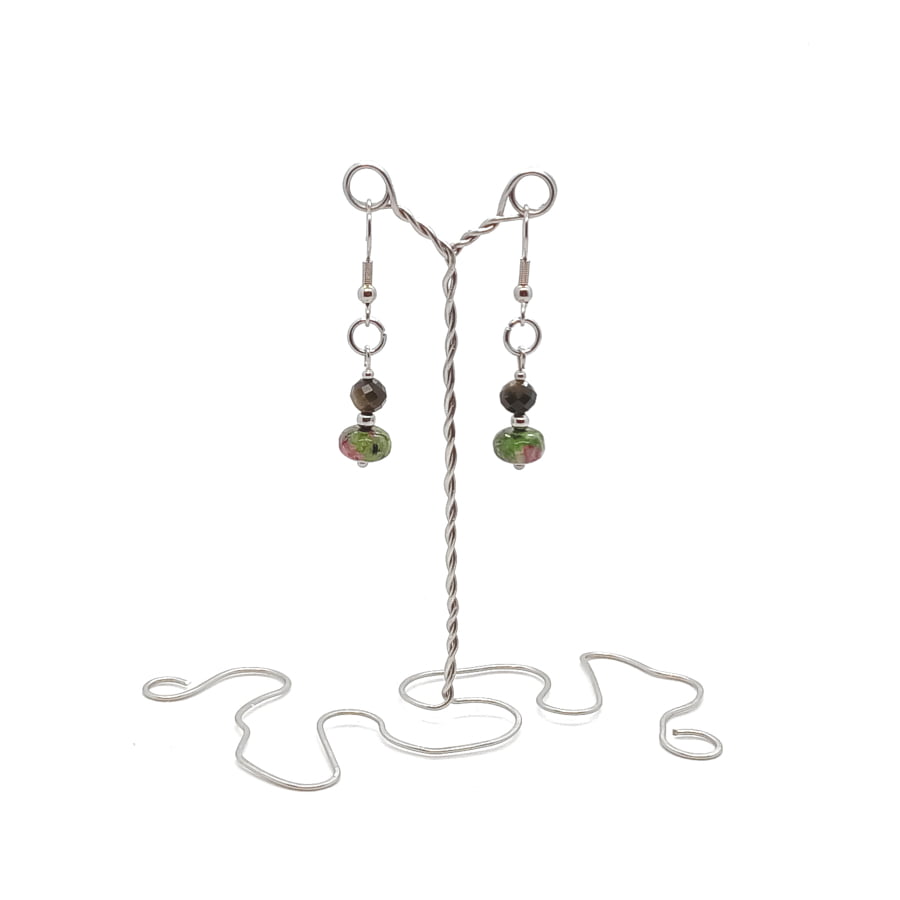 Kolczyki – kamienie naturalne: Zoizyt z rubinem, Złoty obsydian. Kolczyki z kamieniami naturalnymi wykonane ręcznie. Długość kolczyka wynosi 42mm. Kolczyki wyposażone są w bigle otwarte (sierpy) ze stali chirurgicznej. Zoizyt z rubinem o średnicy 8mm, Złoty obsydian o średnicy 6mm. Elementy dodatkowe ze stali chirurgicznej – kulki o średnicy 3mm i 2mm. Kolczyki z kamieni naturalnych wykonane ręcznie w Polsce – Kolczyki Made in Poland.